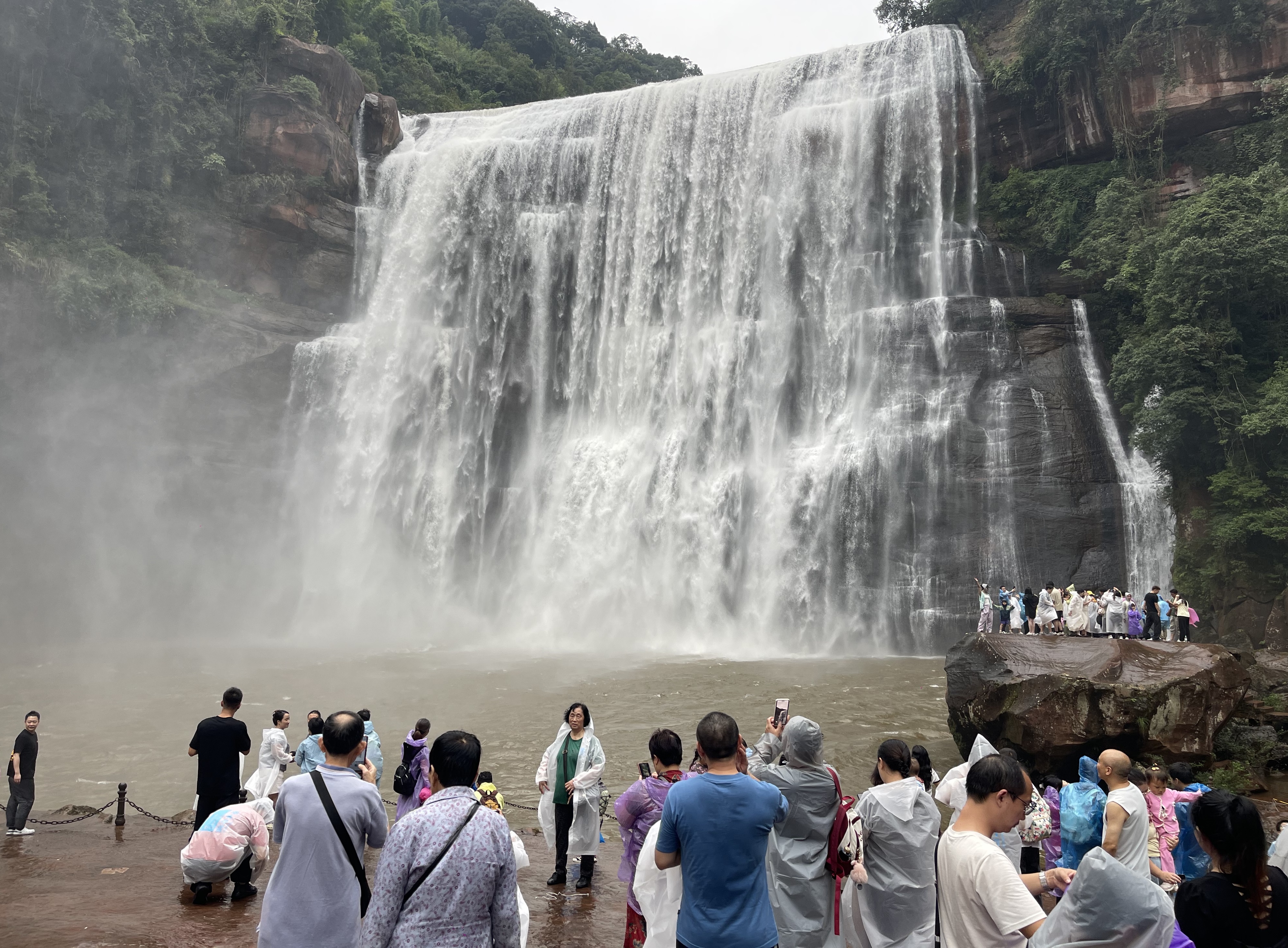 沿着紧贴崖壁的狭窄廊道拾阶而上,人们陆续步入瀑布内侧,体验洞中观瀑的奇景。身处瀑布之后,透过巨大水幕,眼前蒸腾的白色水雾与脚下延伸的赤色岩层交相辉映,岩层表面的纹路如水流般舒展蔓延。