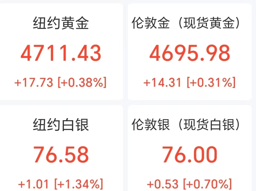 商品方面,贵金属集体上扬,现货黄金一度突破4700美元/盎司,日内涨近0.4%。现货白银涨0.7%,纽约白银期货涨超1.3%。