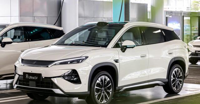 宋Ultra EV定位中型SUV,车身尺寸为4850/1910/1670毫米,轴距达到2840毫米。外观延续比亚迪家族化设计语言,采用锐利大灯组及镀铬饰条衔接。内饰部分配备15.6英寸悬浮式旋转屏幕和10.25英寸液晶仪表盘,换挡机构位于方向盘柱。